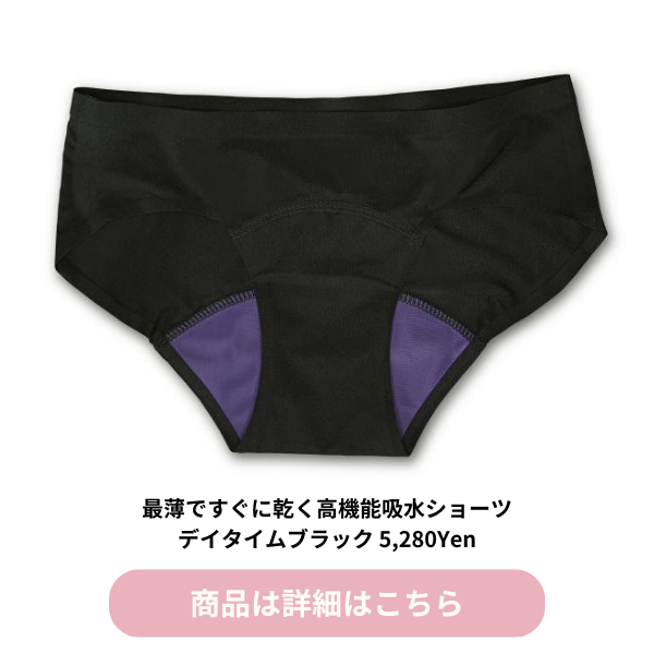 今日なるかも! という日は吸水ショーツを履いていれば大丈夫。余計なナプキン1枚が不要になります。さらに、3日4日目の少ない日も吸水ショーツ1枚あれば、ナプキン4枚分の吸水量なので使えます! 尿もれなどの対策で日常づかいもできますよ!