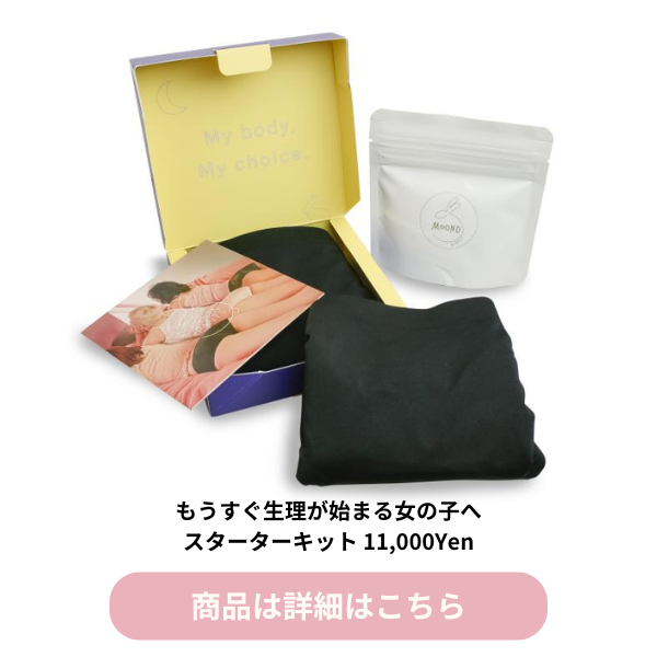 そろそろ初潮を迎えそうなお年頃のお嬢さんへ、ムーンパンツのスターターキットがおすすめです! 初潮後、生理がいつ始まるかわからない不安や、学校でナプキンを持ち出すときの気恥ずかしさ、トイレでもナプキンを交換するときの音に気を遣ったりと、心配事も多いのではないでしょうか。そんなプチストレスも、ムーンパンツが解決してくれますよ!