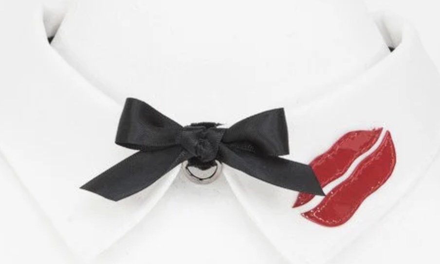 カラーは緊張感のある真っ白いサテンです。裏側がやさしいベルベット素材で肌を傷めません。襟元の赤いエナメルのリップが強烈なアクセントになっています。