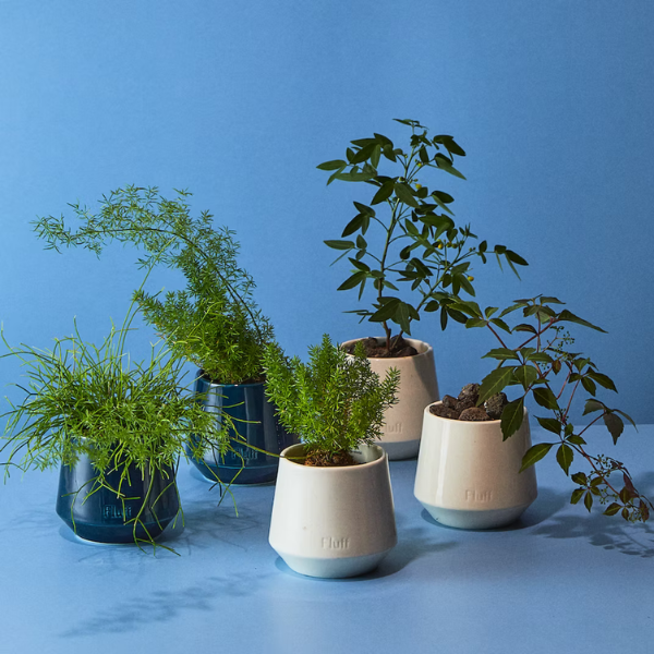 白い陶器は雨上がりの深い森をイメージした香り「ウォーターフォレスト」青い陶器は深夜の空をイメージした「ミッドナイトプラネット」