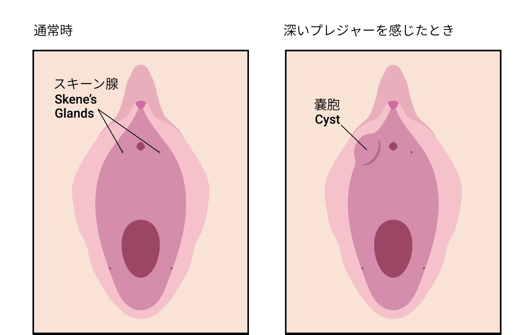 膣とクリトリスの両方が同時に刺激されるため、オーガズムの時の痙攣が深く、膣の中も深く脈打ち、またスキーン腺による射精に似たような反応もあります。スキーン腺による射精に似た症状は、Gスポットが刺激され、尿道両側のスキーン腺も同時に刺激されることで起こるもので、日本の暴力的なポルノなどで女性器を無理矢理刺激し放尿させることを「潮吹き」と呼んでるような類のものではありません。そもそも尿ではありません。