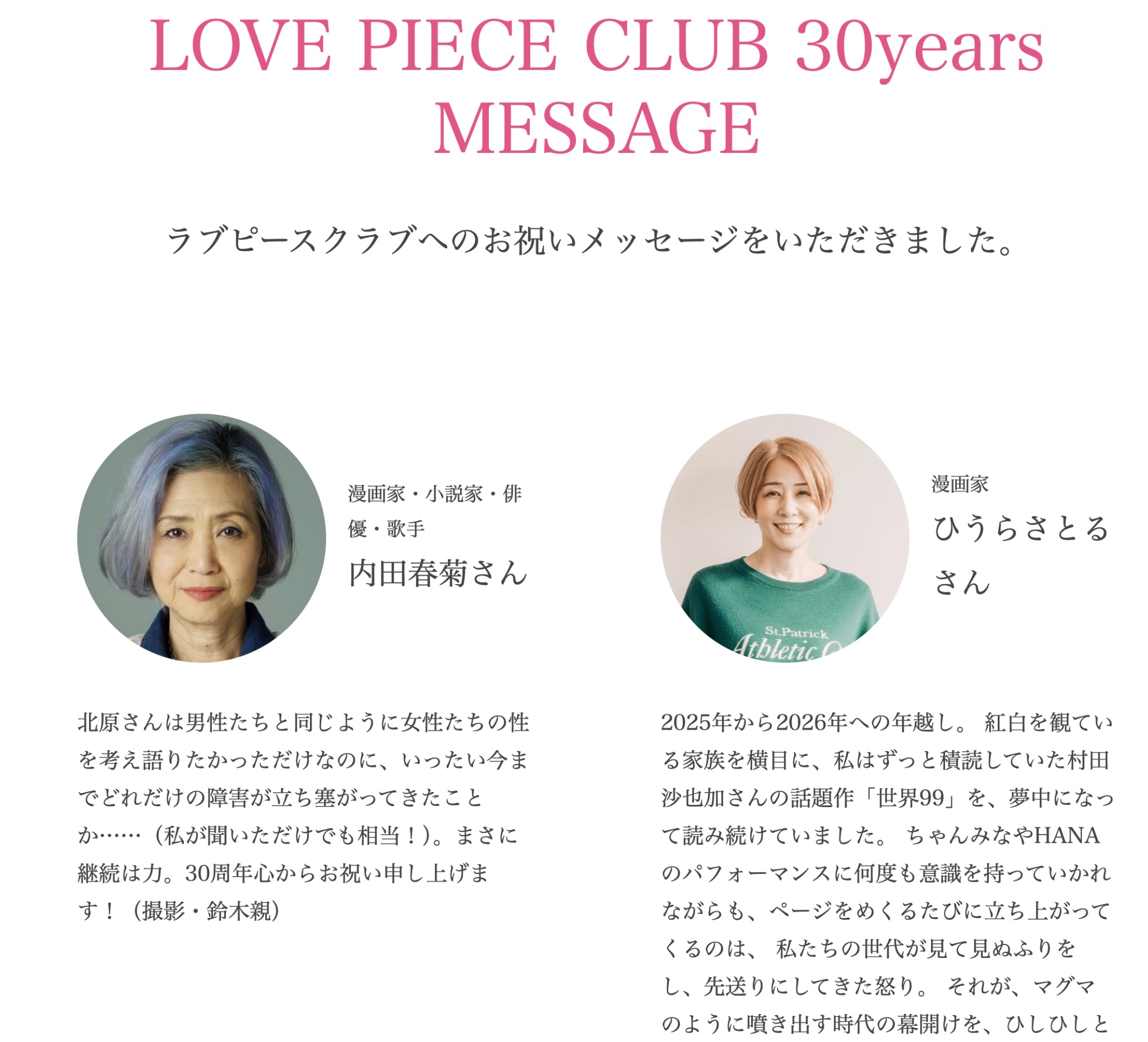 ラブピースクラブの30周年を歩みを特設ページにつくりました。またたくさんの方に30周年のメッセージも次々にいただいています。ぜひこちらもチェックしてください。ラブピースクラブをはじめたきっかけとなったイベントや、これまでの歩みの一部を掲載しています。*昔のことすぎて、写真があまりない・・・という残念さもありますが読んでいただけたら嬉しいです。【SISTERHOOD MESSAGE】